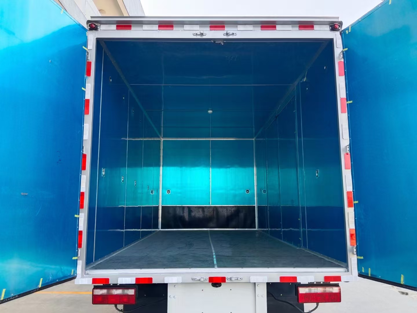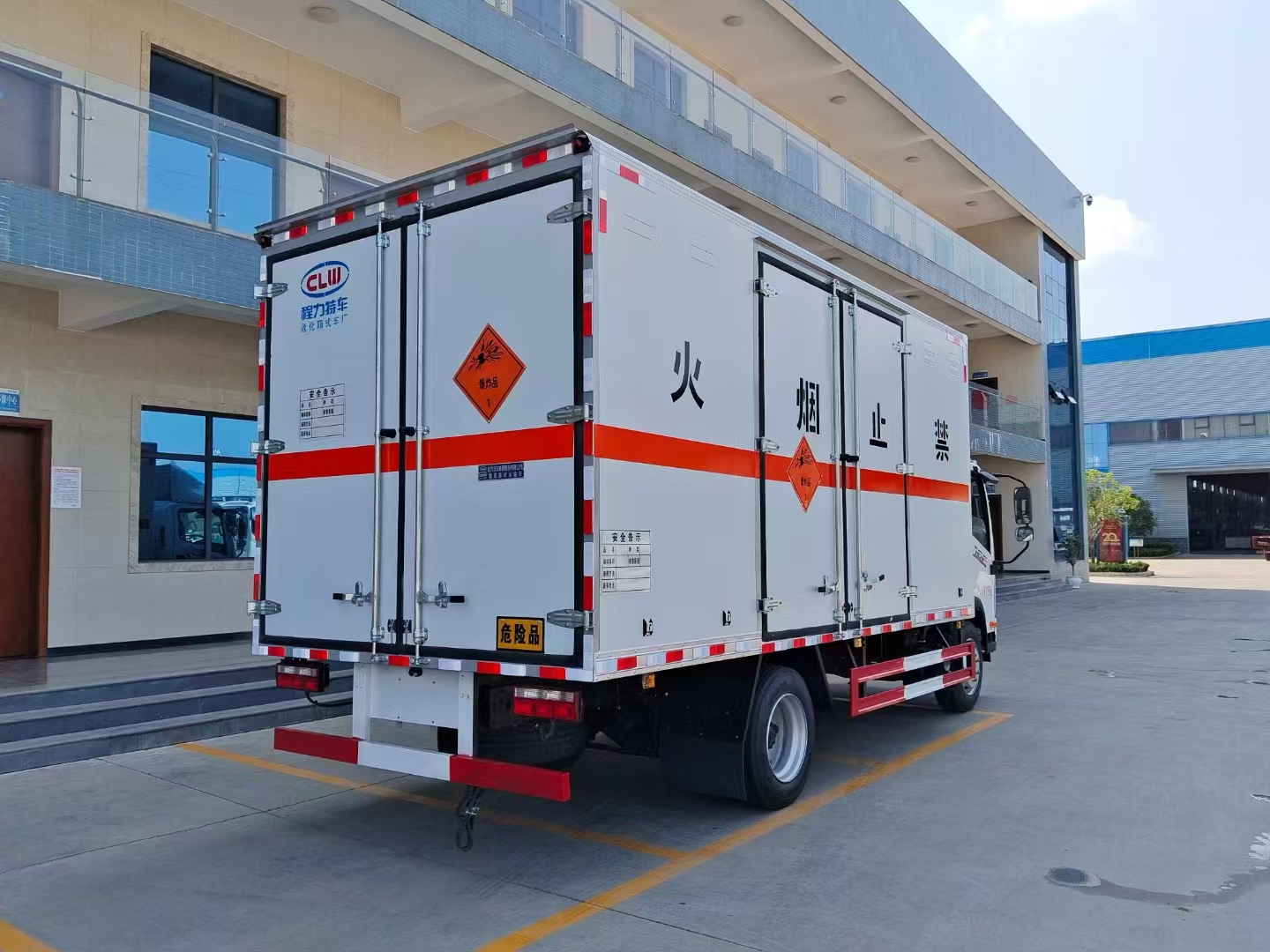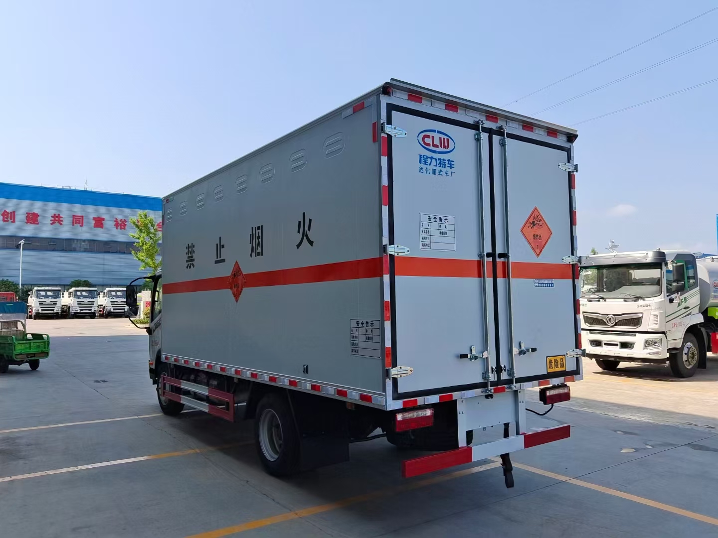 貨箱配置 廂體為雙層金屬骨架結(jié)構(gòu),外板采用冷軋鋼板,中間填充阻燃泡沫,內(nèi)飾為鋁板。底板為平板上鋪防靜電膠皮。廂內(nèi)兩側(cè)加裝固定貨物臥環(huán),門框帶防盜報(bào)警器,頂部帶煙霧報(bào)警器,廂體右側(cè)選裝側(cè)門,隨車配2個(gè)滅火器,危險(xiǎn)標(biāo)志牌,防火帽,危險(xiǎn)品三角頂燈。 (尾部可選裝液壓升降尾板)