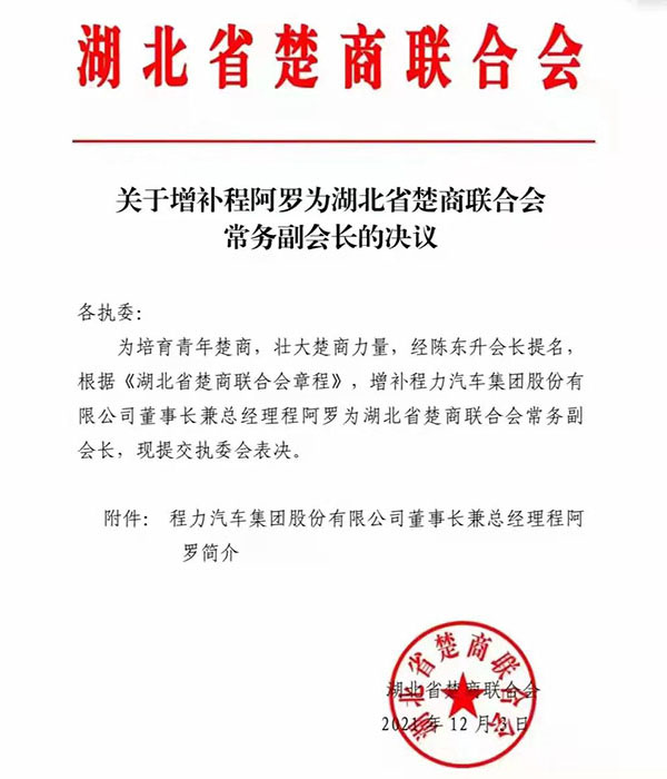 “虎威熠熠踏征程,八面來風(fēng)共聚首”,程阿羅總經(jīng)理作為省青企聯(lián)會(huì)長暨湖北省楚商聯(lián)合會(huì)常務(wù)副會(huì)長,由于其掌舵的程力汽車集團(tuán)在中國專汽行業(yè)所作出的突出貢獻(xiàn),特別是2021年在疫情反復(fù)肆掠,各種自然災(zāi)害和國際國內(nèi)市場震蕩低迷等不確定因素疊加效應(yīng)影響下,程力集團(tuán)萬眾一心攻堅(jiān)克難,全年完成87億專汽產(chǎn)值,仍保持了2位數(shù)的百分比增幅,在全省“緩復(fù)蘇、補(bǔ)損失”的大環(huán)境下,保持了穩(wěn)健的發(fā)展勢頭,應(yīng)邀出席了湖北省年度經(jīng)濟(jì)工作會(huì)議,聆聽了湖北省委應(yīng)勇書記和王忠林省長的發(fā)言和工作報(bào)告,積極為湖北經(jīng)濟(jì)發(fā)展建言獻(xiàn)策。